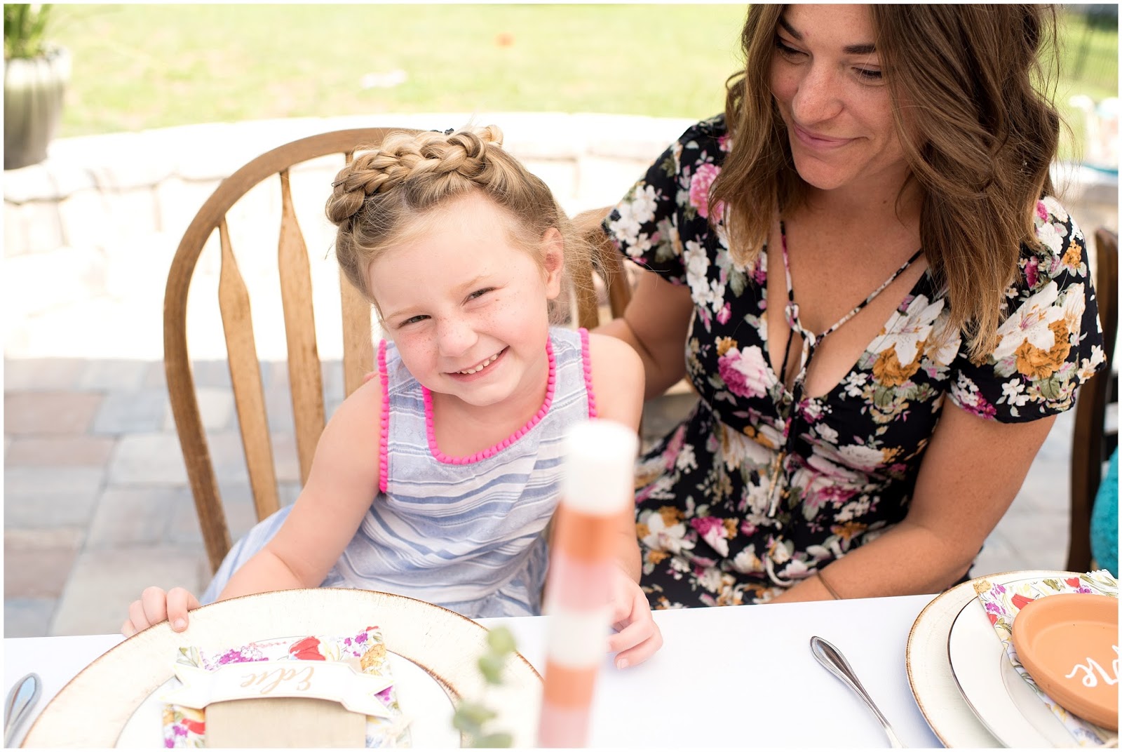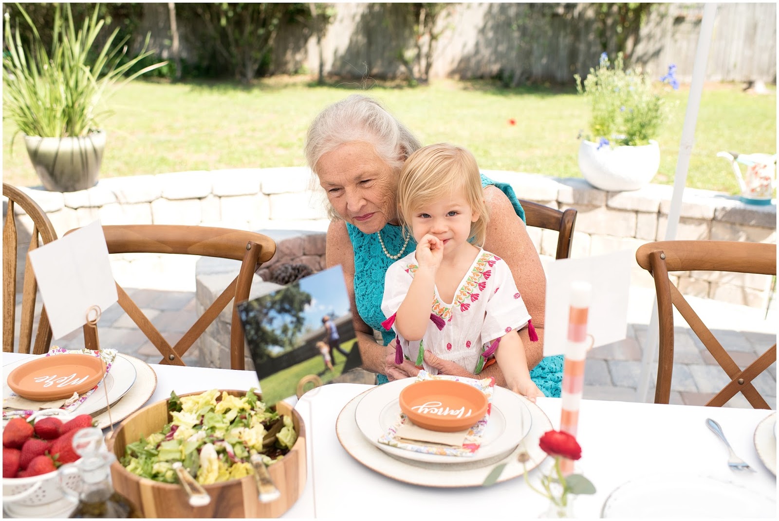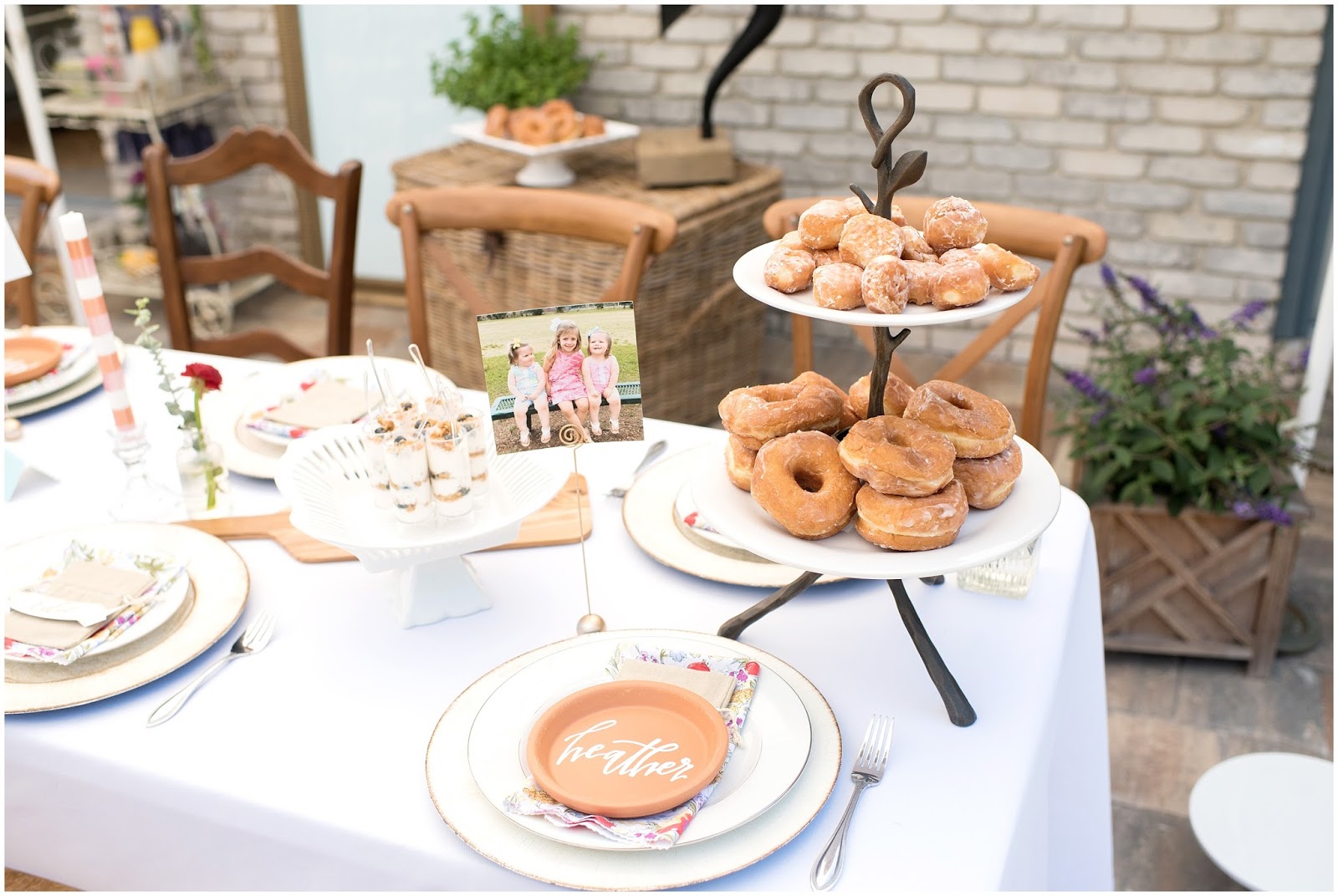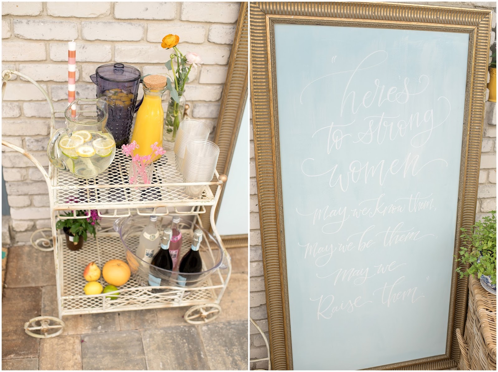 Some of my favorite elements of the brunch were the individual terracotta plates with guest names on them that I collaborated with LMS Creative Studio to create! She also hand lettered a beautiful framed sign with the quote: “HERE’S TO STRONG WOMEN, MAY WE KNOW THEM, MAY WE RAISE THEM, MAY WE BE THEM.” Which really was the inspiration for this entire celebration. I even made the sweet little vintage inspired cloth napkins! One of the details I am most proud of was the photo I had printed of each of the honored guests and who looks up to them as their role model, their children!