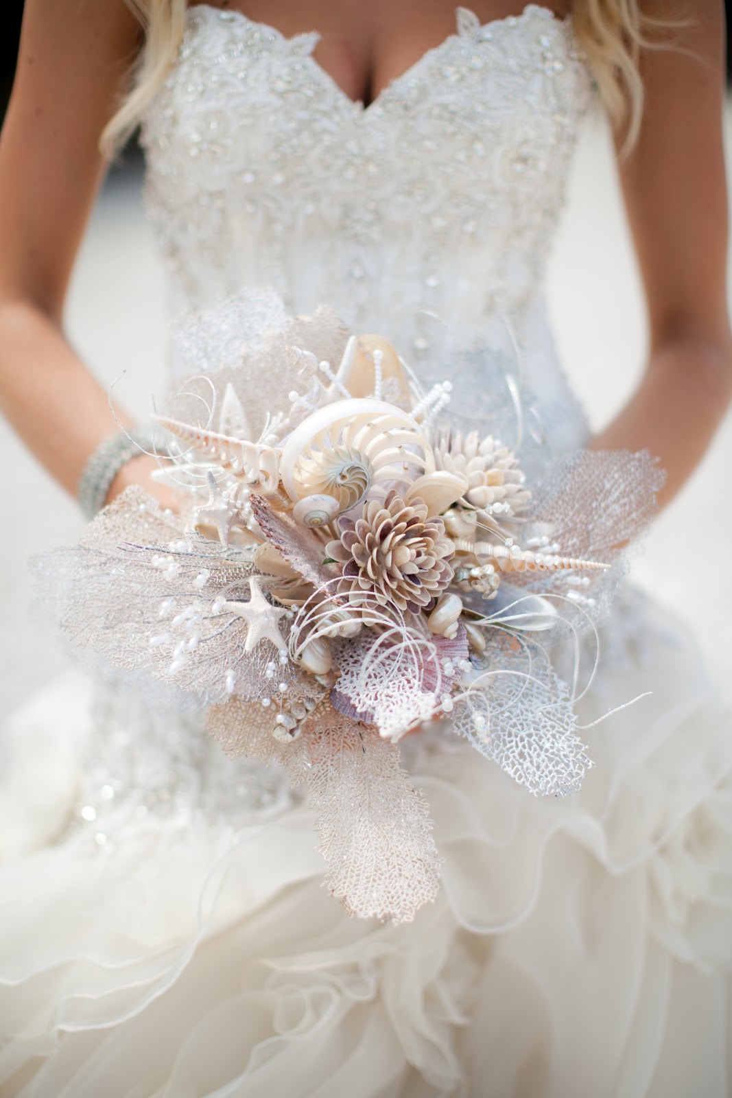Her beautiful, non-traditional, bridal bouquet – completely made from elements of the sea.